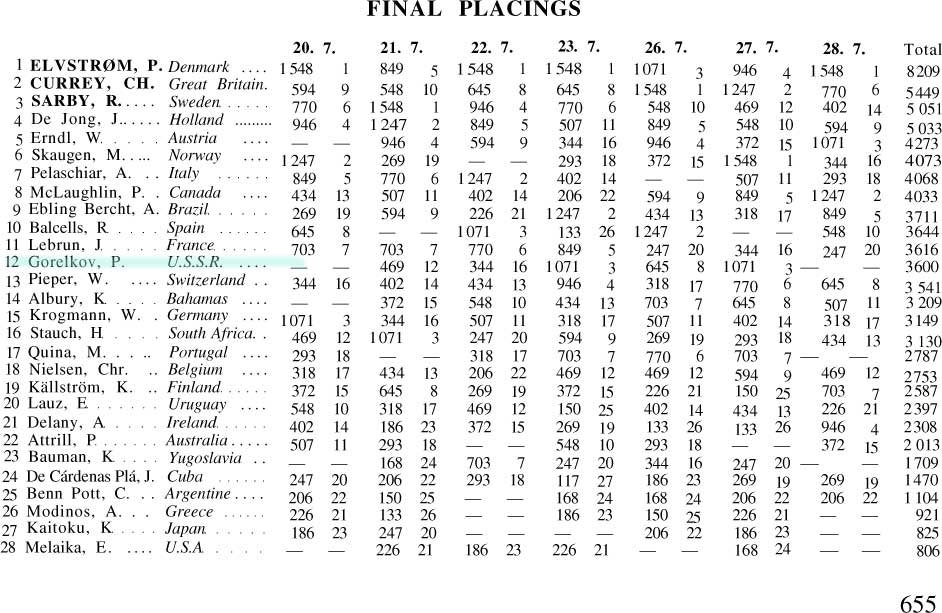 Пауль Эльвстрем тогда пришел на Олимпиаду опытным, натренированным. Он очень интенсивно готовился к Олимпиаде. Как он нам рассказывал, он сделал специальное устройство для имитации откренивания в ванной. Причем именно в ванной потому, что, как он говорил, нас в гонке обливает водой (а тогда никакого «каллипсо» не было и у иностранцев), и соответственно он по полчаса висел в позе откренивания в ванной и поливал себе мышцы холодной водой. Конечно, он был накатанный лучше всех и обгонял всех «в одну калитку». Так вот Эльвстврем на Олимпиаде увидел это неудобство, быстро сообразил что надо делать, нашел какую-то деревяшку, железку и соорудил себе на палубе простой клиновой стопор. Пауль был очень рациональным в этом плане. Но соперники тут же это заметили, написали коллективное письмо – поставлено устройство, отличное от типового, и надо это снять. Ну в общем это пришлось Паулю снять.